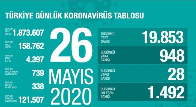 Sağlık Bakanlığından yapılan açıklamaya göre, son 24 saatte 28 kişi korona virüsten hayatını kaybetti, toplam can kaybı ise 4 bin 397'e yükseldi. Bugün toplam 19 bin 853 test yapılırken, 948 yeni vaka tanısı konuldu, toplam vaka sayısı ise 158 bin 762 oldu. Bugünkü bin 492 kişiyle birlikte toplam iyileşen sayısı da 121 bin 507'e yükseldi. Toplam entübe hasta sayısının 338, toplam yoğun bakım hasta sayısının ise 739 olduğu açıklandı.