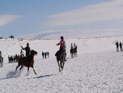 ARDAHAN (İHA) - Ardahan'ın Çıldır ilçesi sınırlarında bulunan ve yüzeyi buzla kaplı olan Çıldır Gölü'nde, 'Altın At 1. Kış Şöleni' düzenlendi. Çıldır Altın At I. Kış Şöleni saat 9.30'da, Çıldır Gölü'nde başladı. Saygı duruşunda bulunulması ve İstiklal Marşı'nın okunmasıyla başlayan şölen, Ardahan Valisi Seyfettin Azizoğlu'nun konuşmasıyla devam etti.