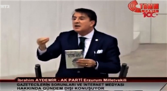 Milletvekili Aydemir, ‘Bakın, elimde bir kitap var. Bendeniz de, burada birkaç arkadaşım var, onlar da biliyorum ki soy ismini bu kitaptan almış, bu kitaba mevzu olan bir kahramandan almış insanlarız. Binlerce, on binlerce insan var bu soy ismi tebcil eden, yücelten. Niye? Muhayyel bir kahramanı o derece içselleştirmişiz ki neredeyse ailenin birer ferdi gibi kabul görmüş. Benim büyüklerim öyle anlatırlardı ki “Bizim büyük bir kahramanımızın soy ismidir.“ diye. Kim yazmış bunu arkadaşlar? Bir hanım muharrir Müfide Ferit Tek hanımefendi yazmış. Şimdi “gazeteci” diye tarif ediyoruz ya da “medyacı; anchorman” envaitürden isimler aldı dolayısıyla da değer kaybetti. Bu muharrir öylesine bir ismi kayda geçiyor ki Millî Mücadele’de özel bir anlam ifade ediyor, cepheye bu isimden dolayı, “Aydemir”den dolayı koşan binler, on binler oluyor. Öyleyse ‘muharrir’ bu derece önemli, bu derece kıymetli; onun bugünkü izdüşümü gazeteciler de böyledir. Ancak “gazetecilik” kavramını kullanan, onu asla ve kata hak etmeyen ve dahası, teröre teşne, terörü teşvik eden, sırf terörü teşvik edebilmek için o kimliği kullanan çok sayıda insan var ve burada çoğu zaman tartışma mevzu oluyor ki: “Gazeteciler cezaevinde, gazeteciler yargılanıyor.” şeklinde şikâyetler geliyor. Çok net söylüyorum burada, çok yakın takip ettim, uzun yıllarını bu mesleğe vermiş birisi olarak takip ettim; tamamı gazetecilik faaliyetinin dışında yargılanmış, sorgulanmış isimler. Niye bu böyle? Çünkü ara yerde bir büyük boşluk var, bu boşluğun mutlaka giderilmesi lazım. 1938 yılında bir kanun çıkıyor “Basında Meslek Birliği” diye, sekiz yıllık bir yürürlük sürecinden sonra kalkıyor. Öyleyse, yeniden bunun mutlaka konuşulması lazım, şu yüce çatı altında milletvekili arkadaşlarımızın yeniden gündeme getirmesi lazım. ‘ dedi.