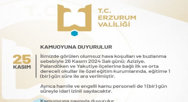 Erzurum’un 3 merkez ilçesinde eğitime Salı günü de ara verilecek. Erzurum Valiliğinin x platformu üzerinden yapılan açıklamasında, ‘ İlimizde görülen olumsuz hava koşulları ve buzlanma sebebiyle 26 Kasım 2024 Salı günü Aziziye, Palandöken ve Yakutiye ilçelerine bağlı ilk ve orta dereceli okullar ile özel eğitim kurumlarında eğitime 1 gün süreyle ara verilmiştir.