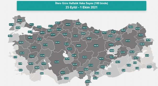 İlk kez her yüz binde görülen vaka sayısının en yüksek olduğu ilk on il içinde Doğu Anadolu Bölgesinden hiçbir il yer almadı. Vaka sayısının 25 Eylül – 1 Ekim 2021 tarihleri arasında nüfusa oranla en yüksek olduğu iller Zonguldak 557,17, Düzce 460,22, Sakarya 449,53, Kastamonu 445,83, Trabzon 436,75, Kütahya 435,24, Kayseri 402,83, Rize 399,29, Tokat 386,04, Kırıkkale 383,2 olarak sıralandı.