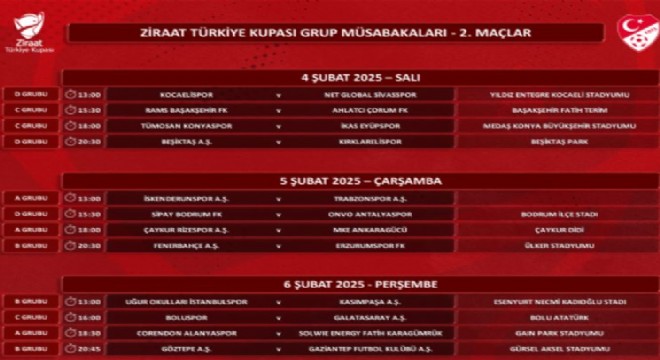 Erzurumspor 5 Şubat’ta Fenerbahçe ile karşılaşacak. İstanbul’daki Türkiye Ziraat Kupası Grup maçı Ülker Stadyumunda oynanacak. TFF Ziraat Türkiye Kupası Grup Aşaması ikinci müsabakalarına ilişkin programı paylaştı. Bu turda müsabakalar 4, 5 ve 6 Şubat 2025 tarihlerinde oynanacak.