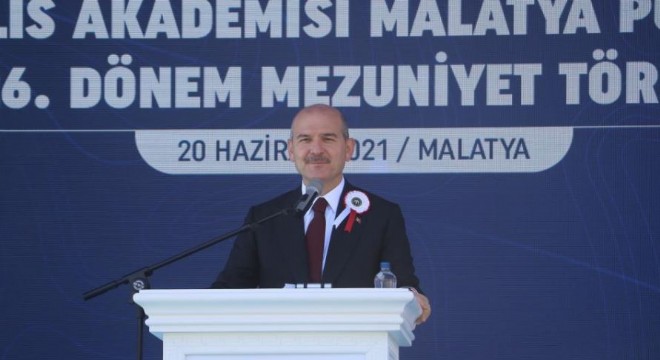 İçişleri Bakanı Süleyman Soylu, Malatya Polis Akademisi'nin 26. dönem mezuniyet törenine katıldı. Bakan Soylu, törende yaptığı konuşmada polis alım ilanına çıkıldığında 105 bin 128 kişinin başvurduğunu anımsatarak, “11 Ekim 2019’da ilana çıktığımızda, ‘7 bin polis alacağız’ dediğimizde ‘ben de varım’ diyen, ön başvuru yapıp bu şerefli üniformayı giymeye talip olan vatan evlatlarının sayısıdır. Bu sayı, bu 105 bin 128 sayısı, bu milletin bu teşkilata sevgisini, iştiyakını, itibarını anlatan sayıdır. Televizyonda bir şehit haberi gördüğünde korkan değil, hırslanan, ‘Bir dalımız kesilirse bin filiz veririz’ diyen bu büyük, asil milletin, ‘Bu bayrağa feda olsun’ diye devletin emrine vermeye hazır olduğu evlatlarının sayısıdır. Biz bu evlatların içinden 7 binini alabildik. Buradaki arkadaşlarımızla birlikte tüm Türkiye’de 24 POMEM merkezinde sınavı geçen 6 bin 760 evladımız bugün mezun olmaktadır. Geride kalan o 98 bin 368 evladımıza, belki yaşı tutmadığı için, belki başka bir nedenden başvuramayan ama gönlü aklı bizimle olan yüzbinlerce evladımıza, onların aslan yürekli ailelerine sesleniyorum. Desteğinizi aldık, mesajınızı aldık, hepiniz bizim gözbebeğimizsiniz, hepiniz bizim gücümüzsünüz ve moralimizsiniz” dedi.