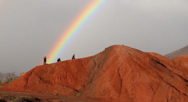 Oltu ilçesinde etkili olan yağmurun ardından Yolboyu Mahallesi’nde bulunan Kırmızı Tepeler, gökkuşağı ile birlikte adeta görsel bir şölen sundu.