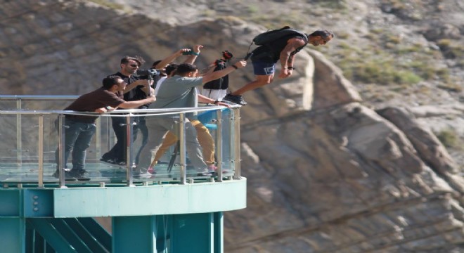 Wingsuit sporcusu Cengiz Koçak, Uzundere'de bulunan cam seyir terasından Tortum Gölü'ne başarılı bir atlayış gerçekleştirdi.