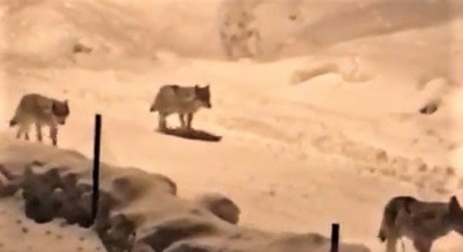Erzurum’da köye inen 4 kurt vatandaşlar tarafından cep telefonuyla görüntülendi. Gece saatlerinde köyün içerisine gelen ve yiyecek bulmak için sağa sola bakınan kurtlar, daha sonra ormanlık alana gitti.
