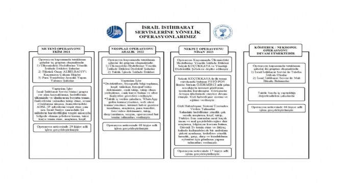 Milli İstihbarat Teşkilatı’nın İsrail İstihbarat Servisi bağlantılı şahıslara 2021 yılında başlattığı operasyonlar devam ediyor. Güvenlik kaynaklarından edinilen bilgilere göre, İsrail İstihbarat Servisinin ele aldığı yabancı şahıslara yönelik 2021’deki operasyon ile özel dedektifler ve taktik elemanlara yönelik 2022’deki operasyon sonrasında 58’i yabancı, 39’u Türkiye Cumhuriyeti vatandaşı toplam 97 kişiye uygulama yapıldı. İlk aşamada bunlardan 51’i tutuklanırken, söz konusu şahısların dava süreci devam ediyor. Öte yandan, İsrailli ajanlar ile yurtdışında düzenli şekilde buluşan ve İsrail İstihbaratının verdiği görevleri yerine getiren Selçuk Küçükkaya ve 16 kişiden oluşan şebeke Nisan 2023 ayında çökertildi.