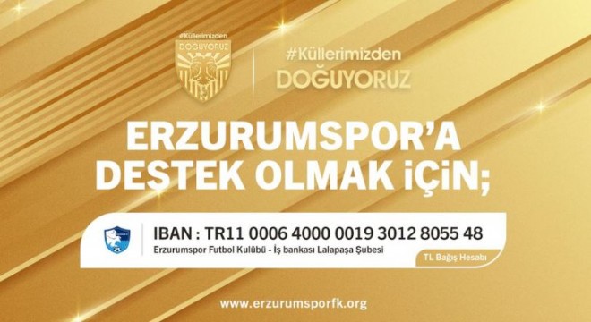 Erzurumspor yönetimince başlatılan Küllerimizden Yeniden Doğuyoruz kampanyası kapsamında destek tutarının 6.1 milyon liraya yükseldiği açıklandı. Kulüp kurumsal web sitesinden Başkan Dal adına yapılan açıklamada, ‘“Küllerimizden Doğuyoruz” temasıyla başlattığımız ve Doğuş adını verdiğimiz özel formamızdan alarak kampanyamıza katılan ve bağış yapanlara teşekkür ediyorum. İki günde 61 forma ve 6.100.000 TL tutarındaki destek miktarı kulübümüzün hesaplarına yatırılmıştır. ‘ iadelerine yer verildi.