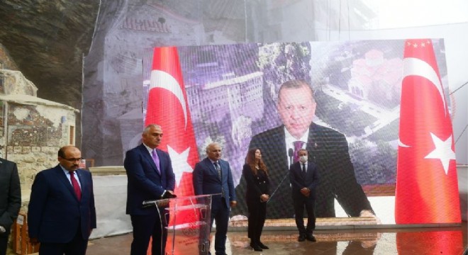 Trabzon’da restorasyonları tamamlanan Sümela Manastırı ile Ortahisar Ayasofya Camii’nin hayırlı olmasını dileyen Erdoğan, “Sümela Manastırı, ülkemizin tanıtımının önemli sembollerinden biridir. Yaklaşık 1600 yıllık mazisi olan bu eser, ecdadın bölgeye yerleşmesi ve tümüyle fethinin ardından da olduğu gibi korunarak bugünlere gelmiştir. Kayalara oyulmuş bir dizi yapıdan oluşan Sümela Manastırında bölgeye hakim olan tüm medeniyetlerin izlerini görmek mümkün. Bu eser en parlak dönemlerini 19. Yüzyılda yaşamış, Rus işgalinin ardından ise boşaltılarak mahzun kalmıştır. Bu güzel yapıdaki eserlerin bir kısmı 1930’lu yıllarda Yunanistan’a götürülmüştür. Ülkemizin her değeri gibi bu esere de biz sahip çıktık. Altındere Vadisinin gerdanlığı olarak nitelenen bu güzel eseri yeniden dünya kültür mirasına kazandırmak için uzun yıllardır çalışmalar yürütüyoruz. Daha önce çevresini, su kemerlerini ve manastıra çıkan merdivenleri kullanılabilir hale biz getirmiştik. Bugün manastırın üzerinde bulunduğu kaya yüzeylerinin iyileştirilmesi ağırlıklı restorasyonların bir bölümünün daha açılışını yapıyoruz” ifadelerini kullandı.