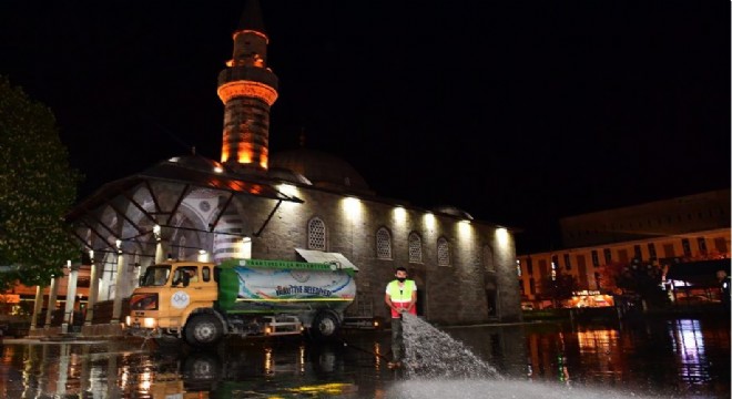 Yakutiye Belediyesi Temizlik İşleri Müdürlüğü ekipleri, yarın kılınmaya başlanacak olan cuma namazı öncesi ilçe merkezindeki meydan ve cami bahçelerinde hummalı bir temizlik çalışması başlattı.